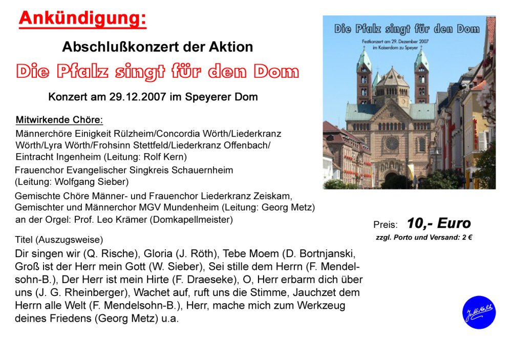 CD vom Abschlusskonzert im Speyerer Dom am 29.12.2007 für 10 Euro gfls. zzgl. 2 Euro Porto/Verpackung