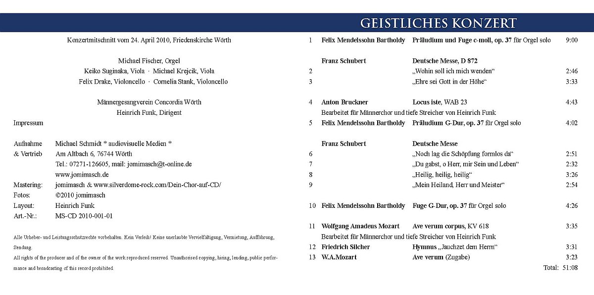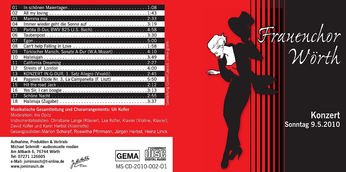 hier sind die von mir erstellten AUDIO-CDs aufgeführt. Diese können entweder über die Chöre (Vorsitzende, Sängerinnen und Sänger) oder über den angegebenen Kontakt bestellt werden. Bei Versand außerhalb der Ortsteile Wörth und Maximiliansau fallen zusätzlich 2 Euro für Porto und Verpackung an.