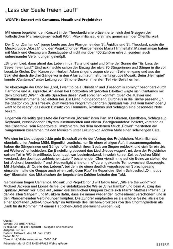 Das Konzert am Samstag, den 31.Mai 2008 in der Kath. Kirche St. Theodard in Wörth war ein voller Erfolg. Über 400 Zuhörer durften sich an den von den beiden Chören und der Musikgruppe MOSAIK gekonnt vorgetragenen modernen kirchlichen Liedern, Gospels und Instrumentalstücken erfreuen.